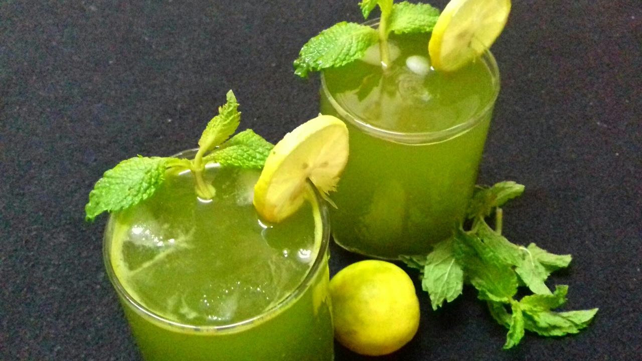 कच्चे आम को उबालकर उसका गूदा निकाल लें। उसमें पुदीना, मसाले और चीनी मिलाकर ब्लेंड करें और ठंडा पानी डालकर सर्व करें।