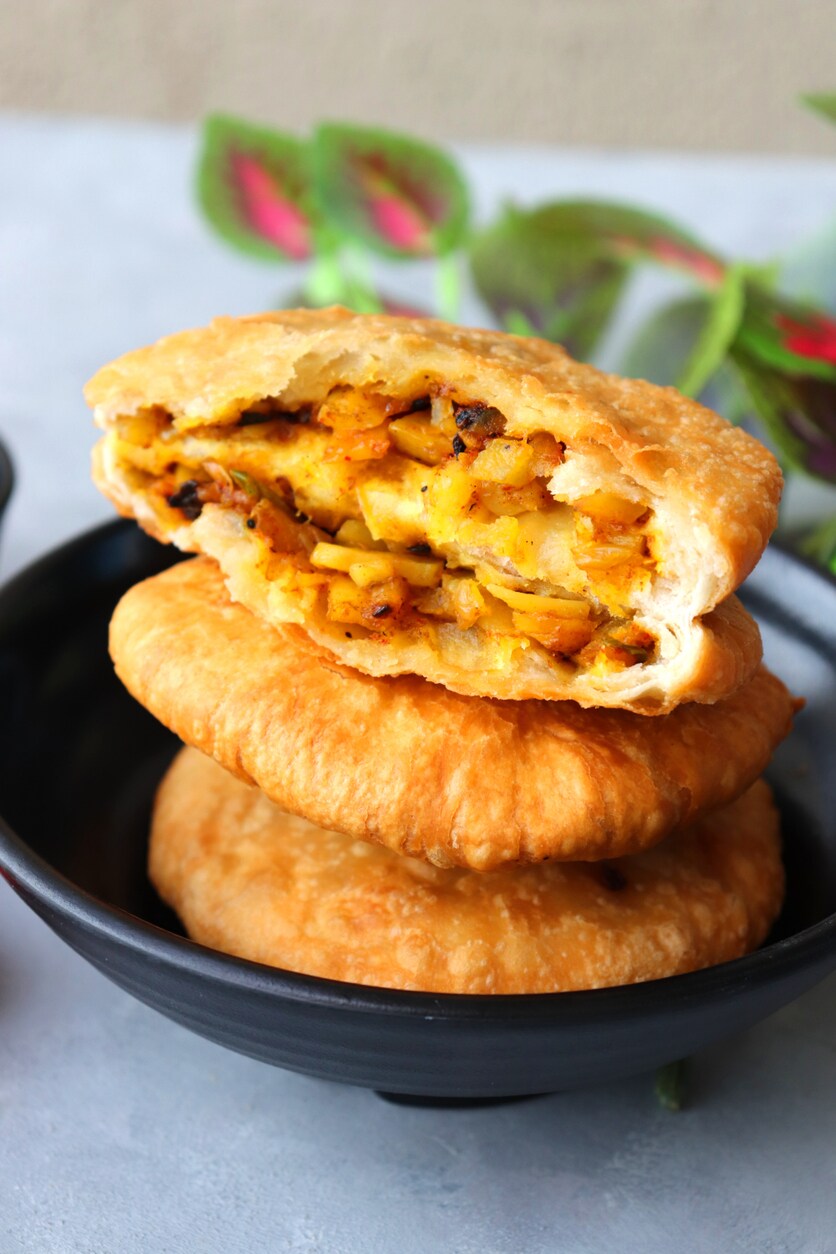 आटे की लोई बेलकर सांचे में रखें और भरावन भरें।